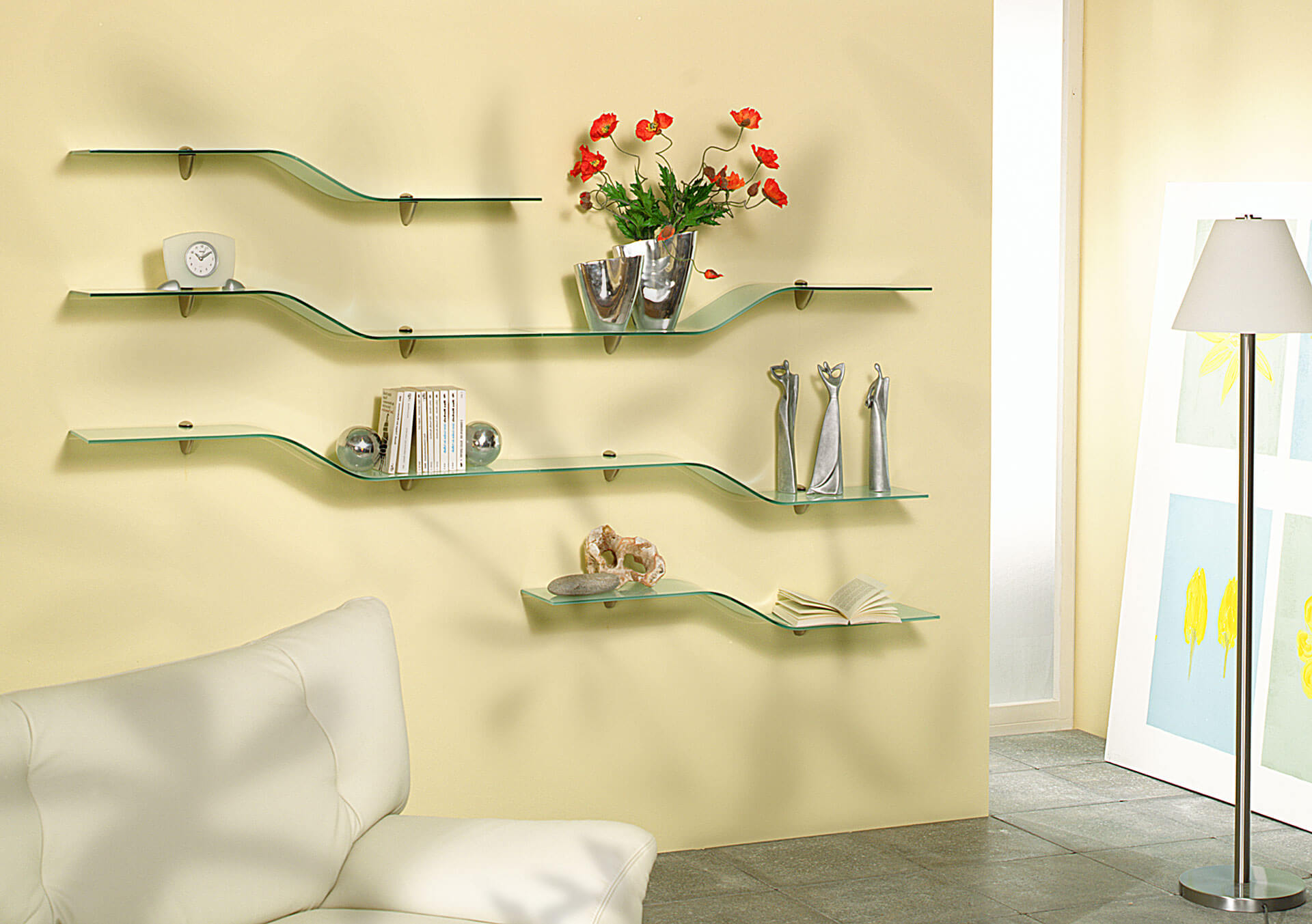 Az üvegpolcok ideálisak a piperecikkek, dekorációs tárgyak és tisztálkodószerek tárolására. Nagy előnye, hogy könnyen, gyorsan tisztítható és nedvességálló.